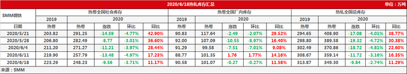据SMM钢铁6月18日讯:本周热轧板卷总库存349.3万吨,环比-2.74%,同比+11.29%。本周热卷期现价格延续高位震荡,市场成交偏平淡,导致热轧总库存虽延续降势,但环比降幅再度收窄。