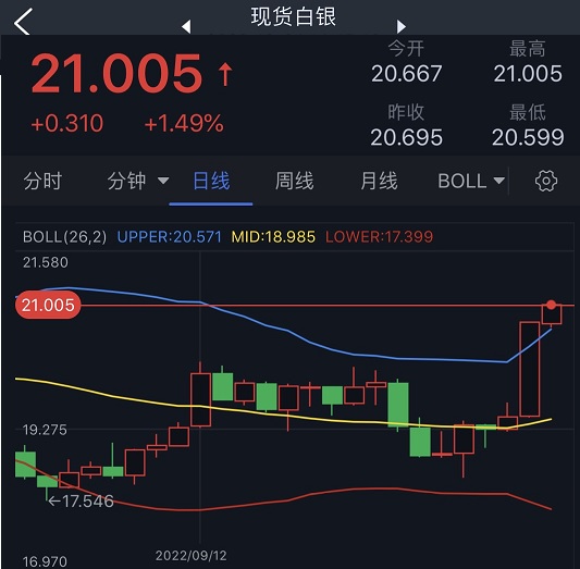 现货白银周一收盘暴涨8.78%,报20.695美元/盎司。