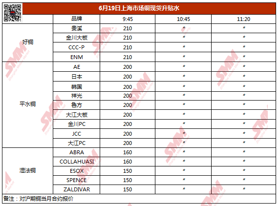 【SMM价格】6月19日上海市场铜现货升贴水(第一时段)