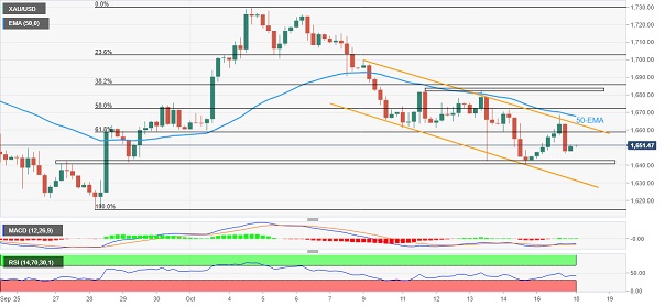 假如突破1664美元/盎司,那么在试图重新控制局势之前,攻克1670美元/盎司附近的50周期指数移动平均线(EMA)障碍对于黄金多头相当重要。