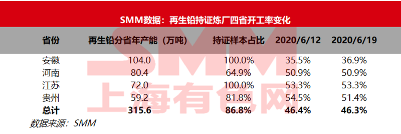 据上海有色网(SMM)调研,本周(6月13日—6月19日)SMM再生铅持证冶炼企业四省周度开工率为46.3%,环比上周下调0.1%