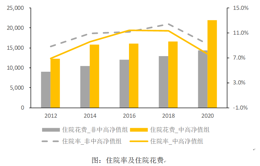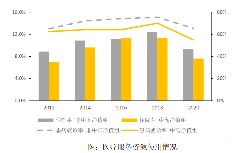 白皮书显示,中高净值人群的住院率和患病就诊率均低于非中高净值人群,医疗资源使用频率偏低。与之相对,中高净值人群的住院费用及年度家庭医疗总开支却明显更高,这意味着其在使用医疗服务资源时追求更高层次的服务需求。