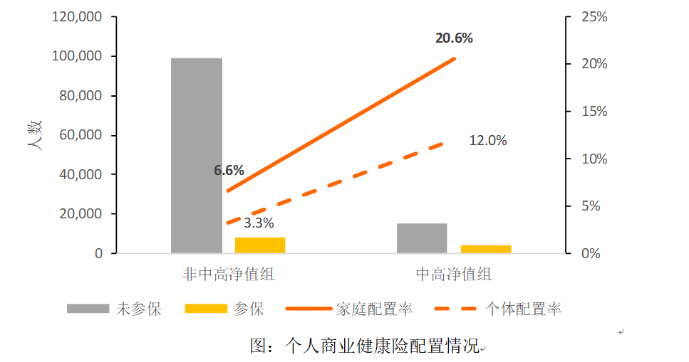 白皮书指出,约有20.6%中高净值家庭配置了商业健康险,中高净值家庭中成员拥有商业健康险比例为12%。与之相对,非中高净值家庭这两项数据分别为6.6%和3.3%。由此可见,无论在个人还是家庭层面,中高净值家庭商业健康险覆盖面更广,覆盖程度也更深。