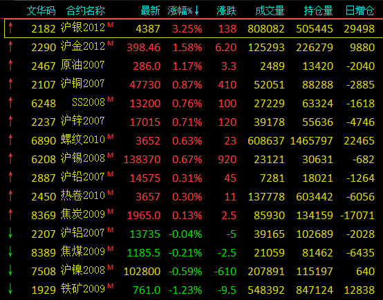 截止9时30分,金属及原油市场合约情况: