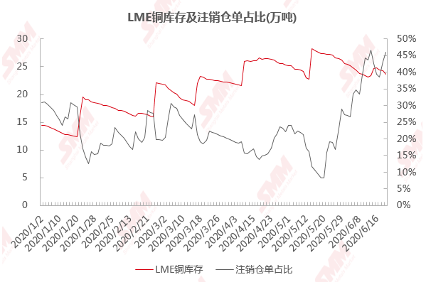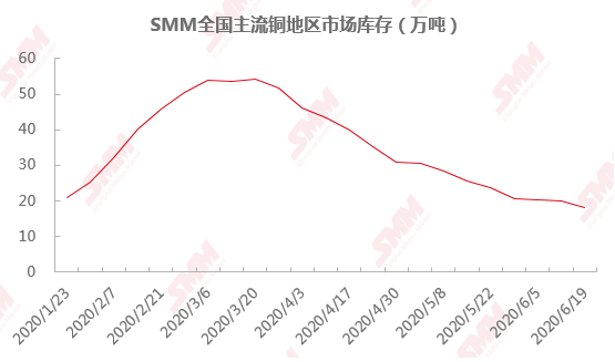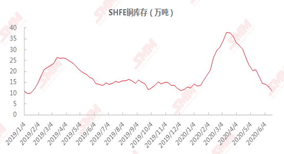 从SMM全国主流铜社会地区铜库存来看,自国内疫情逐步得到控制后,一直处于降库状态,并创下年迄今库存最低水平。截至上周五, SMM全国主流铜地区市场库存总计17.99万吨,环比下降1.9万吨,且降库速度环比加快。SMM之前预计6月SMM全国主流铜地区市场库存或将迎来累库,从社会库存的变化情况来看,国内铜消费好于预期。这一点从终端的数据也能得到映证,例如,5月基建投资环比增长10.9%,同比降幅收窄至-3.3%;房地产新开工和竣工面积环比也继续修复。