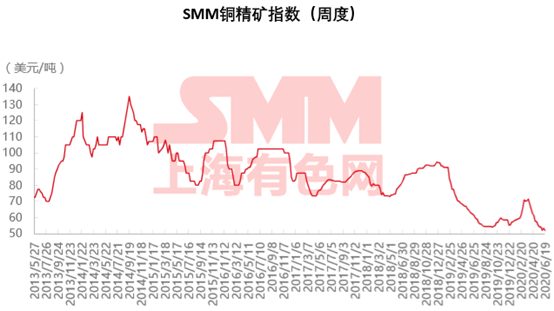从供应端来看,目前海外矿山逐渐重启,但是恢复速度缓慢。3-4月份是海外大型矿山集中减停产的时期,算上装船及发运时间,货物抵达国内的时间基本为6-7月,国内6-7月的铜精矿供应将十分紧张。铜精矿现货TC自4月以来大幅走低。截至上周五,SMM铜精矿指数(周)报51.49美元/吨,环比上周下降0.11美元/吨,区间未发生明显变动,卖方挺价情绪下价格继续僵持于50美元/吨低位。