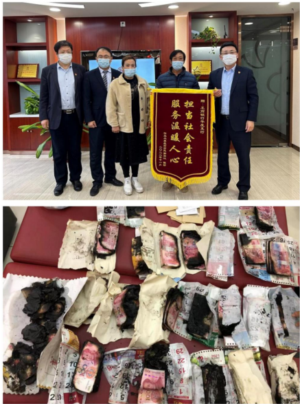 第二天一早,平度工行指派专人专程驱车陪同客户到人民银行兑换剩余火烧币。经过多方协调及专业鉴定,历经8小时的清点、辨认、重组、整理后,再次成功为客户兑换31万余元现金。