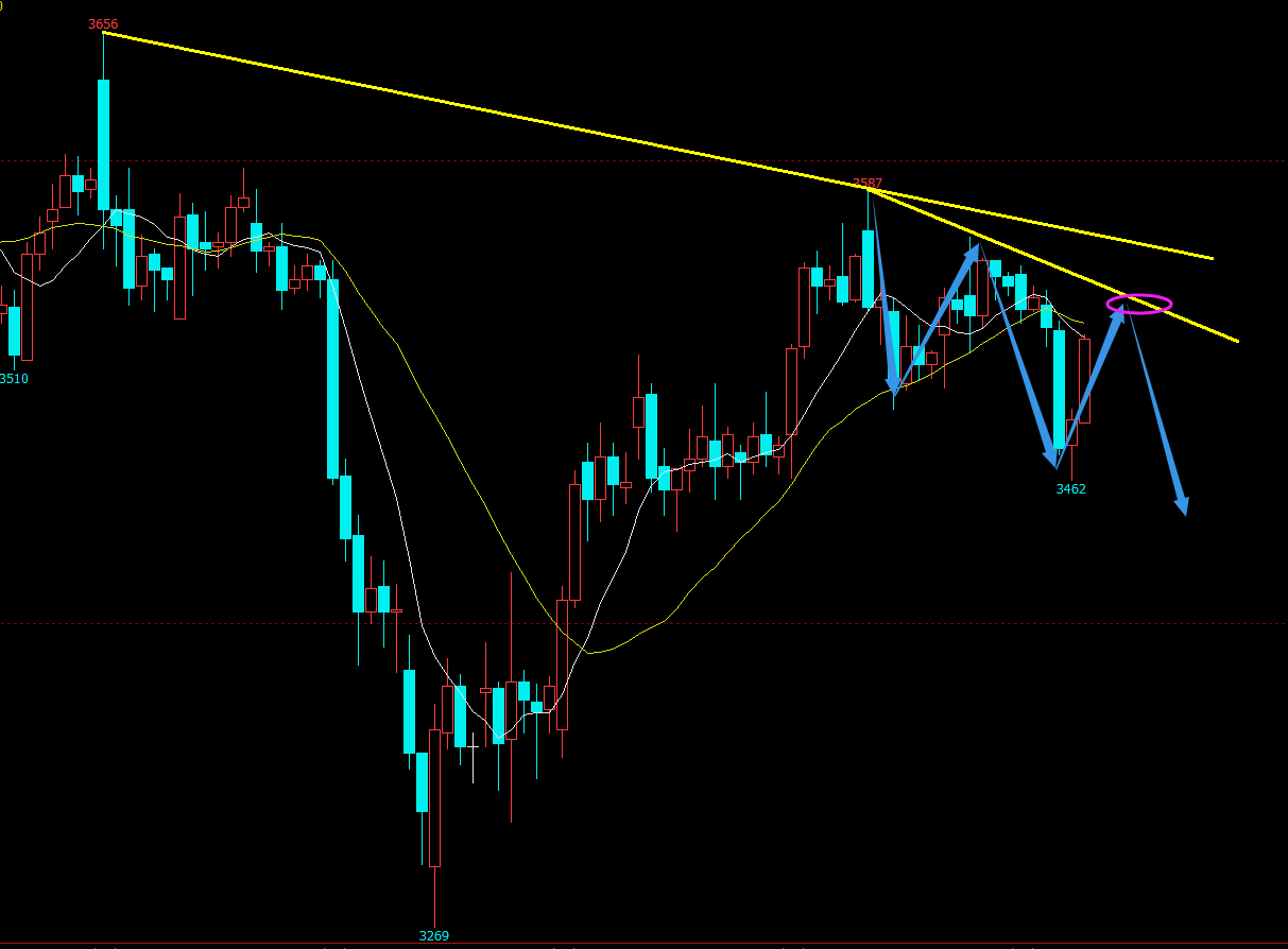 建议:操作上建议逢高做空为主,关注上方下行趋势线3540附近。