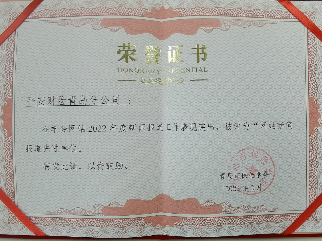 近日,青岛市保险学会发布了《关于表彰2022年度学会官网新闻报道先进单位及先进个人的决定》,青岛产险荣获“新闻报道先进单位”,这也是自2014年学会网站上线以来,分公司连续第八年获得该奖项。