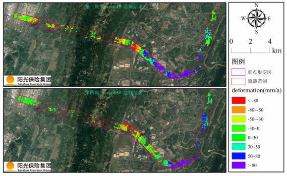 通过卫星遥感监测、无人机航拍+3D建模、红外热像等技术,阳光财险打造出了多个客户满意的风险减量服务创新案例。2021-2022年,阳光财险为首席承保的重庆轨道交通项目制定了基于卫星遥感变形监测技术的专项防灾防损服务方案,针对施工过程中、工程竣工后两个阶段对周边环境的变形影响较大、周期长、范围广的特点,设计监测覆盖范围,并根据季度监测报告提供建设性的防灾防损建议。
