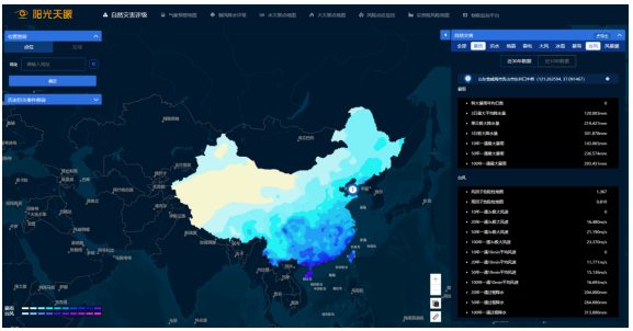 为满足风险减量服务中对于风险评估、灾害预警的需求,阳光财险推出“阳光天眼风险地图平台”,融合灾害、地理、气象、保险等多学科,以暴雨、台风、地震、洪水、雪灾、大风、冰雹、雷电、风暴潮等九种常见气象灾害为研究范围,建立风险评估模型,实现客户自动化线上化评估自然灾害风险与强风降水的功能。平台集成全国布设的物联网设备运行数据,通过中央监控大屏实时监测运行状态,并在设备发生预警时及时向企业安全负责人和阳光财险的风控工程师同步发送信息,实现企业的风险监控、快速预警和及时处置。
