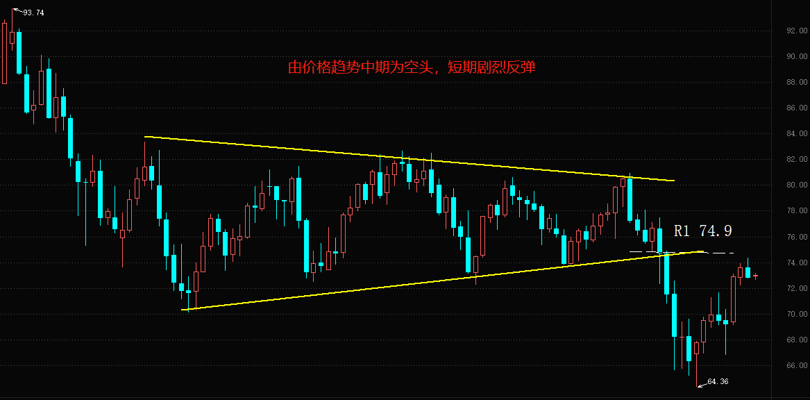 技术角度看,WTI短期的反弹尚未触及R1 74.9阻力位。空头趋势结构犹存。如果未来WTI的价格上涨至收敛三角形区间(黄色线部分)的中部区域,则反弹的持续时间将大大拉长。昨日公布的美国至3月24日当周EIA原油库存最新值减少了748.9万桶,而预期值为增加9.2万桶。虽然EIA原油库存曲线整体上处于上升状态,但是短期的降幅超预期激烈。伴随着市场对欧美银行体系流动性问题担忧情绪的减弱,原油的需求面将会一定程度回升。综合来看,WTI反弹至黄色区域的概率较高,空头交易者需要做好风险管理。