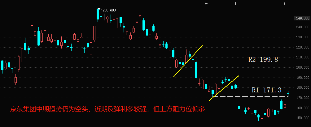 技术角度看,京东集团的中期趋势依旧为空头,3月21日至今的反弹持续时间较长,但并未破坏空头结构。短期阻力位在R1 171.3港元,中期阻力位是R2 199.8港元。由于恒生指数近期同样处于反弹状态,预计京东集团的上涨仍将持续。密切关注本轮上涨结束之后的新一轮回调,如果回调的最低点没有创出年内新低,则空头趋势转变为多头趋势的概率大大提高。