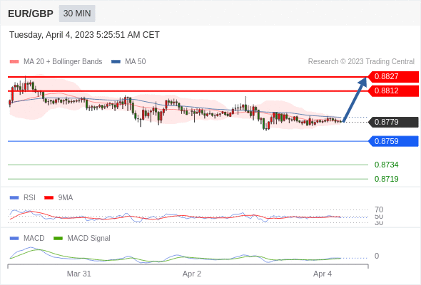 欧元/英镑 当日内: 有上涨的可能,目标价位定在 0.8827 。