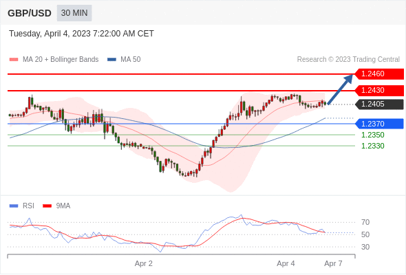 在 1.2370 之上,看涨,目标价位为 1.2430 ,然后为 1.2460 。