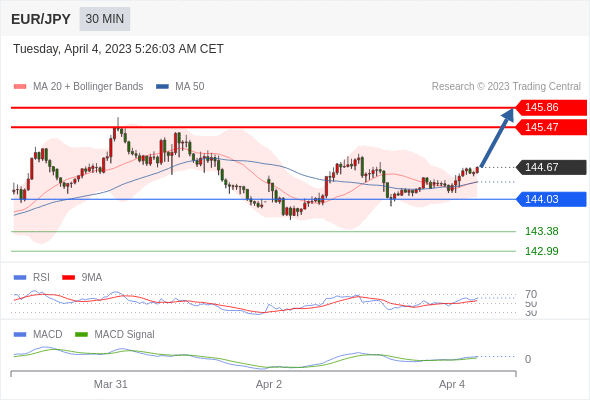 欧元/日元 当日内: 看涨,当 144.03 为支撑位。