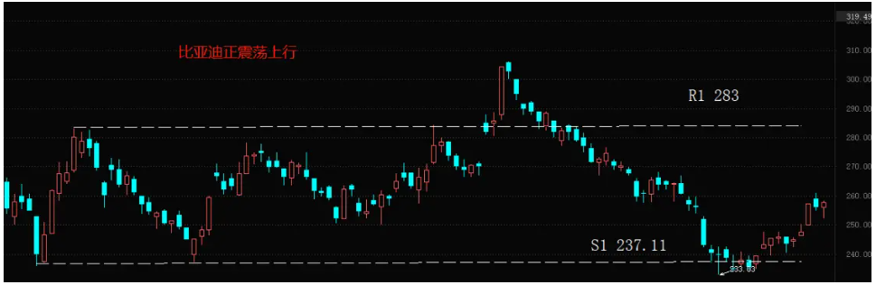 技术角度看,去年10月28日以来,比亚迪的股价就围绕237.11~283区间内震荡。今年3月14日触底反弹,目前处于区间内上行状态。月内有可能触及R1 283位置。考虑到当前恒生指数和沪深300指都处于短期上涨态势看看,预计比亚迪股价触及R1的概率比较高。