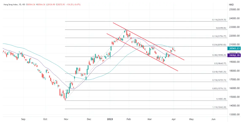 ATFX分析,由于港汇触及7.85弱方兑换保证,为捍卫联系汇率,香港金管局在隔夜纽约时段承接约71.04亿港元卖盘,对于日内港股走弱有一定的指引,不过资金流走压力预计影响有限。恒指近一周来维持在日图均线之间的盘整,其中20均线和此前下行通道顶部集合在19700附近,因此目前留意20000至19700范围内的支撑,阻力范围继续看20500至21000关口。