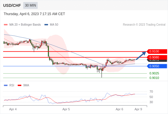 在 0.9050 之上,看涨,目标价位为 0.9080 ,然后为 0.9100 。