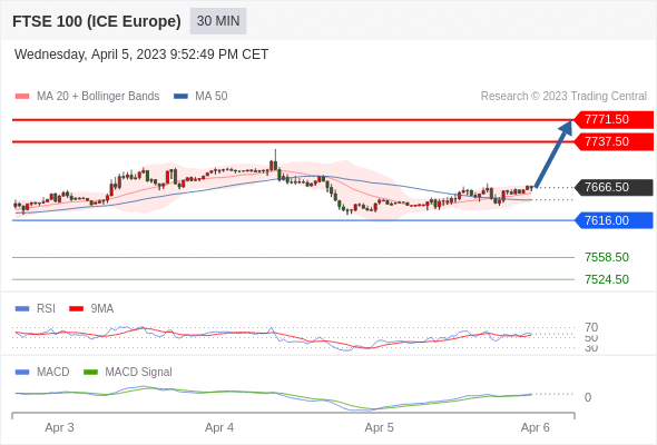 RSI技术指标大于中性区域50。 MACD技术指标呈现看多状态并 处在其信号线的上方。 此外,价位处在其20个时期及50个时期移动平均线上方 ( 当前是 7658.20 和 7647.69 )。