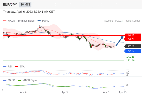 欧元/日元 当日内: 有上涨的可能,目标价位定在 144.17 。