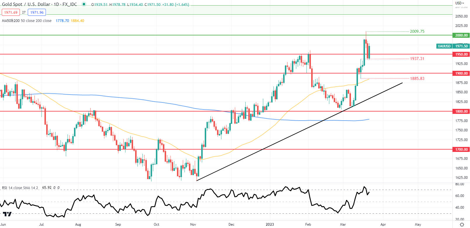 从黄金的长期周线图来看,1950.00阻力手柄(现在是支撑)今年第二次被突破。在这场平局中,随着信心的增强,向2070 2075区域(绿色)反弹的可能性不大。如果我们看一下相对强弱指数(RSI),有看跌背离的迹象,可能表明随着价格走势和RSI延长其相反的走势,可能会出现下跌。尽管最初可能会走高,但到第二季度末,很可能会向1950年及以后回落。50天(黄色)和200天(蓝色)移动平均线正在悄然收敛,并可能在适当时候形成死叉,再次使XAU/USD面临进一步下跌的风险。