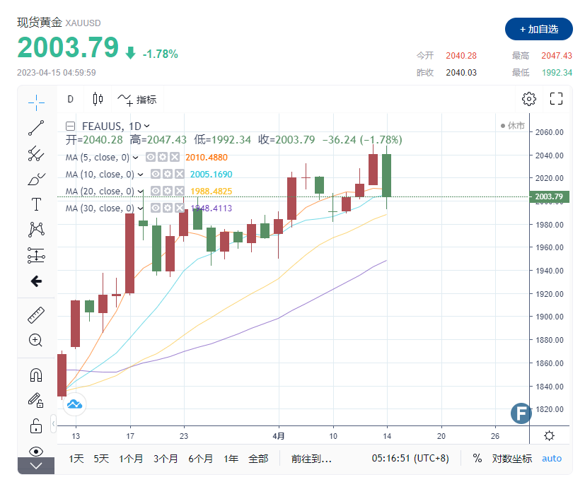 美市尾盘,现货黄金收报2003.79元/盎司,下跌36.24美元或1.78%,日内最高触及2047.43美元/盎司,最低触及2003.79美元/盎司。COMEX 6月黄金期货最后下跌39.5美元至2015.8美元。现货白银下跌1.94%至每盎司0.501美元,现货铂金下跌0.66%至1044.09美元,现货钯金下跌0.36%至1503美元。