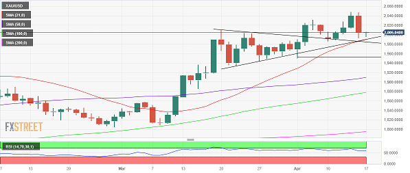 Mehta指出,正如日线图所观察到的,黄金价格上周五达到三角旗形目标价位2043美元/盎司,并进一步挑战关键的2050美元/盎司心理位。然而,黄金价格在接近2050美元/盎司水平遭遇强劲阻力,引发上周五的大幅回调。