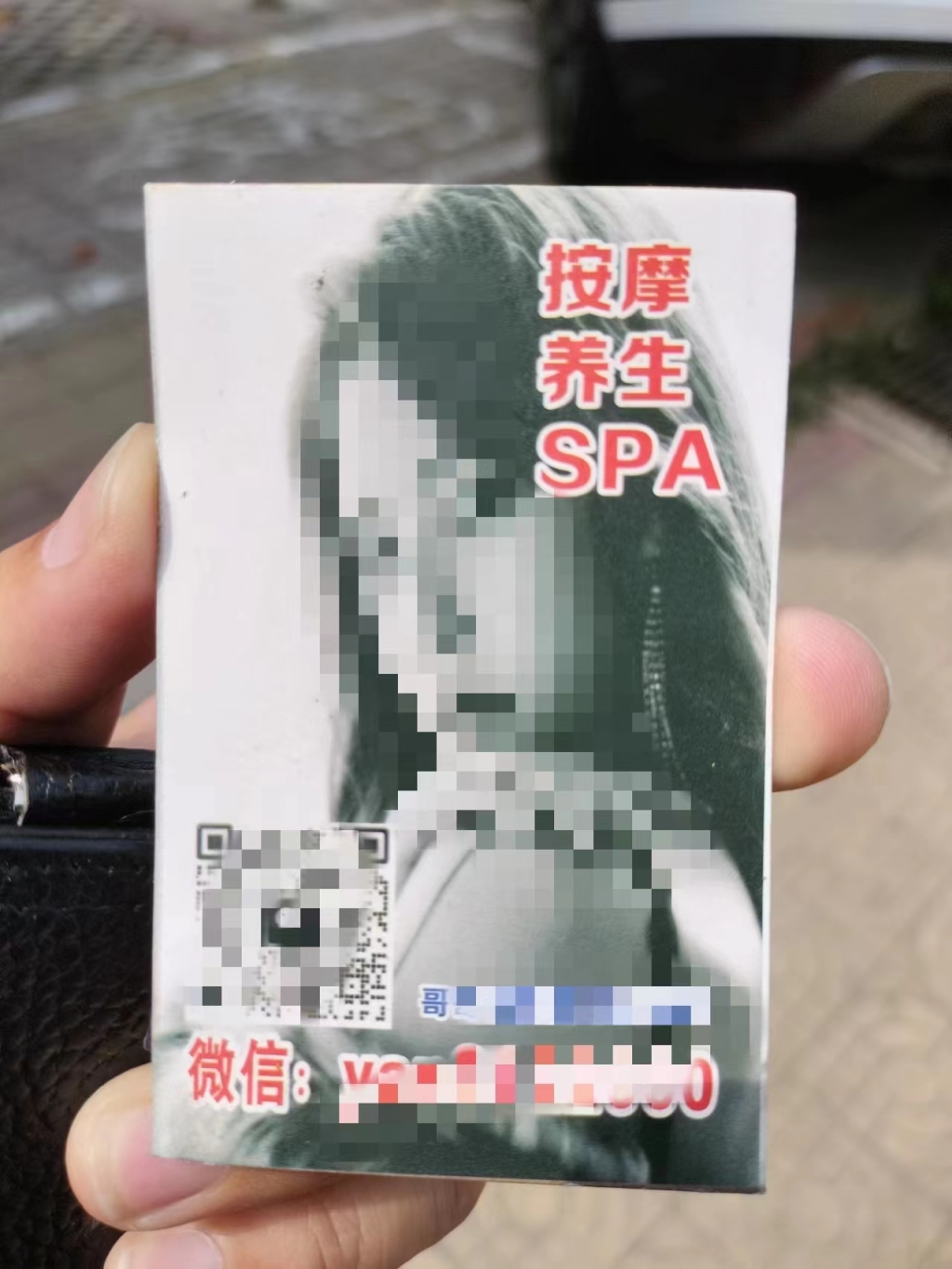 在采访时,记者还在人行道上发现两张小卡片,该小卡片上印有美女照片,写有“按摩养生SPA”,还有二维码和微信号。记者用手机分别扫两个小广告上的二维码,发现一个显示该网址已经禁止访问,一个提示“搜索账号状态异常,无法显示”。