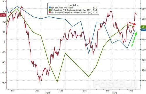 值得一提的是,除了这份最为夺人眼球的ADP数据外,隔夜出炉的其他美国经济数据也不乏同样闪耀的亮点。当天公布的另一项数据显示,随着商业活动和订单加速,6月份美国服务业以4个月来最快的速度扩张。数据显示,6月份ISM非制造业指数上升3.6点,至53.9,为年初以来的最大升幅。