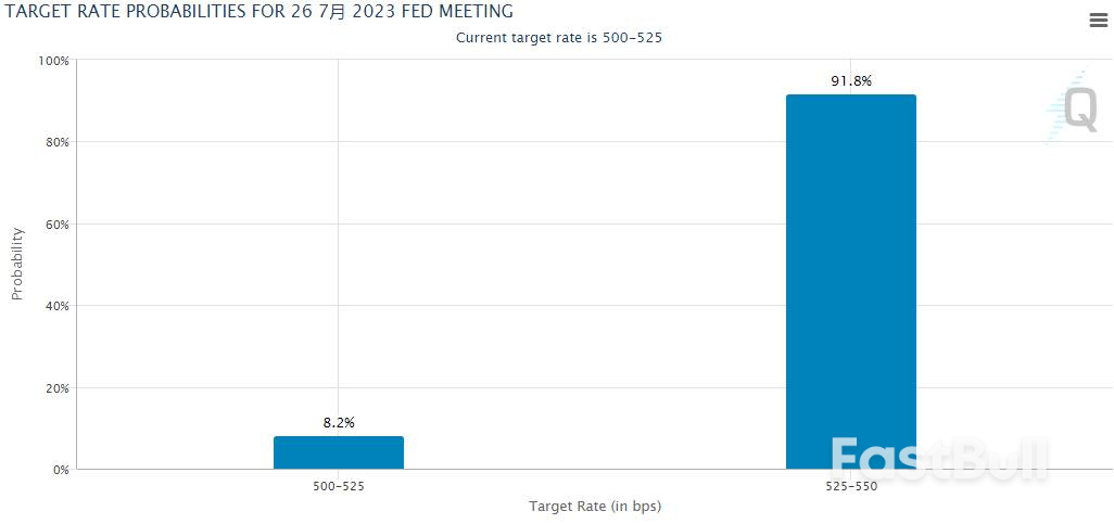 根据货币市场交易员目前的最新预计,在7月26日的下次会议上,美联储加息25个基点的可能性已超过了90%,11月前再加息的可能性也已升至了约50%。美联储官员在上次会议上提交的利率点阵图预测显示,他们的预估中值是今年还会再加息两次。
