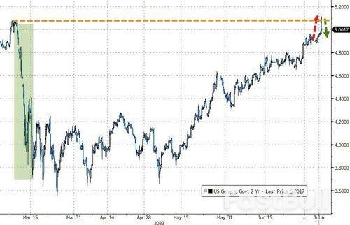 当然,隔夜最受瞩目的行情波动或许还当属债市。美国国债周四盘中重挫,与利率预期关联最为紧密的2年期美债收益率一度“破5”,纽约时段盘初曾最高上涨17个基点至5.12%,突破了3月初触及的水平,尾盘时才逐渐重新回到了5%关口下方。