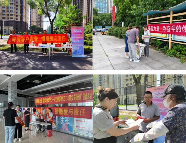 各机构在社区、公园、商场等场所设立咨询服务展台,悬挂条幅标语,面向来往公众发放宣传资料,讲解保险金融知识。
