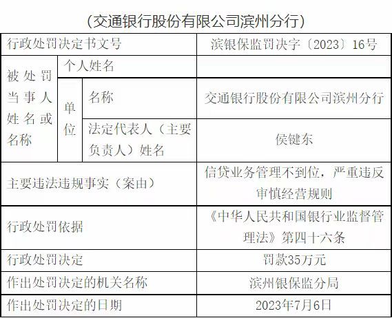 7月17日,国家金融监督管理总局官网公示的来自山东监管局的行政处罚决定书滨银保监罚决字〔2023〕16号显示,交通银行股份有限公司滨州分行因信贷业务管理不到位,严重违反审慎经营规则的,被罚款35万元。作出处罚决定的机关名称是滨州银保监分局,作出处罚决定的日期是2023年7月6日。