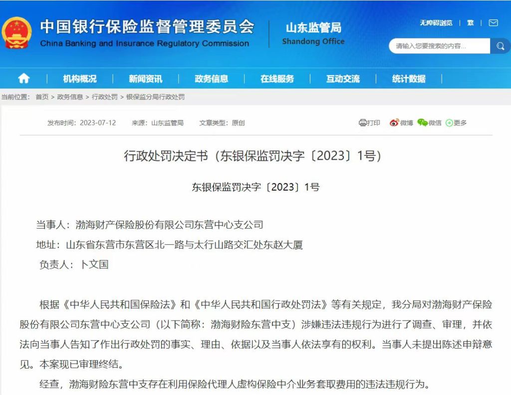 7月12日,银保监会山东监管局官网公示的行政处罚决定书(东银保监罚决字〔2023〕1号)显示,渤海财产保险股份有限公司东营中心支公司存在利用保险代理人虚构保险中介业务套取费用的违法违规行为,具体如下: