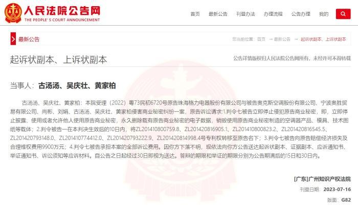 据人民法院公告网近日披露,广州知识产权法院已受理原告珠海格力电器股份有限公司与被告奥克斯空调股份有限公司、宁波奥胜贸易有限公司、尚彬、刘娟、古汤汤、吴庆壮、黄家柏侵害商业秘密纠纷一案。