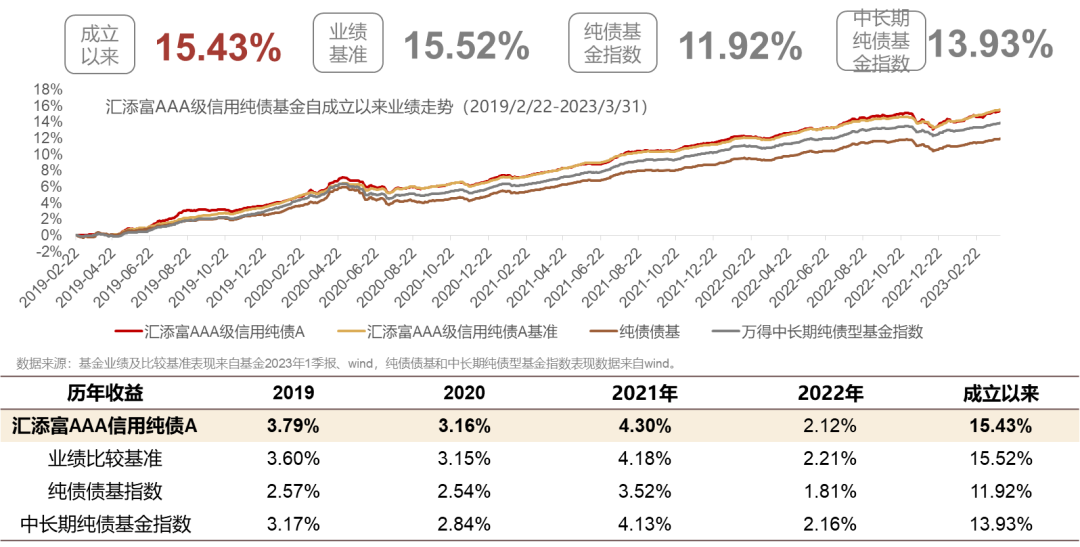 数据来源:基金业绩及比较基准表现来自基金2023年1季报、wind,纯债债基和中长期纯债型基金指数表现数据来自wind。