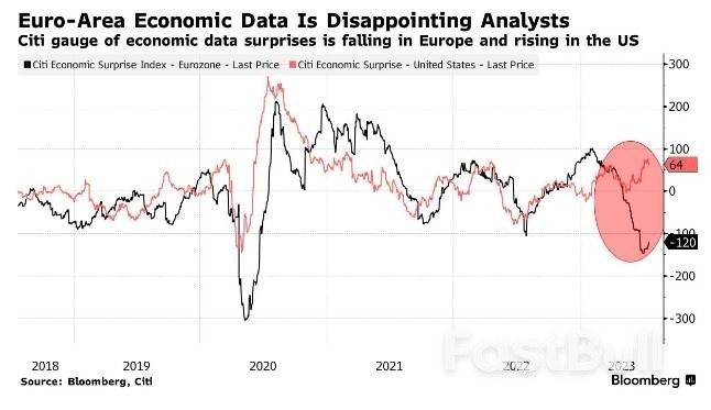欧元区最近的经济数据没有达到预期,导致花旗的经济意外指数(该指数衡量经济数据胜过或未达到预期的程度)下降。过去两个月,该指标与美国的同类指标出现了分歧。