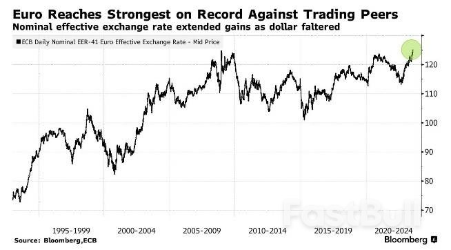 欧元所谓的名义有效汇率(将欧元与欧元区贸易伙伴的货币进行比较)从未如此强劲过,在一系列数据显示欧元区经济接近衰退之际,这可能会削弱该地区出口的吸引力。