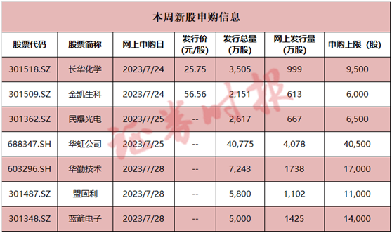 本周(7月24日—7月28日),共有7只新股将进行申购,其中创业板5只(长华化学、金凯生科、民爆光电、盟固利、蓝箭电子),科创板1只(华虹公司),沪市主板1只(华勤技术)。