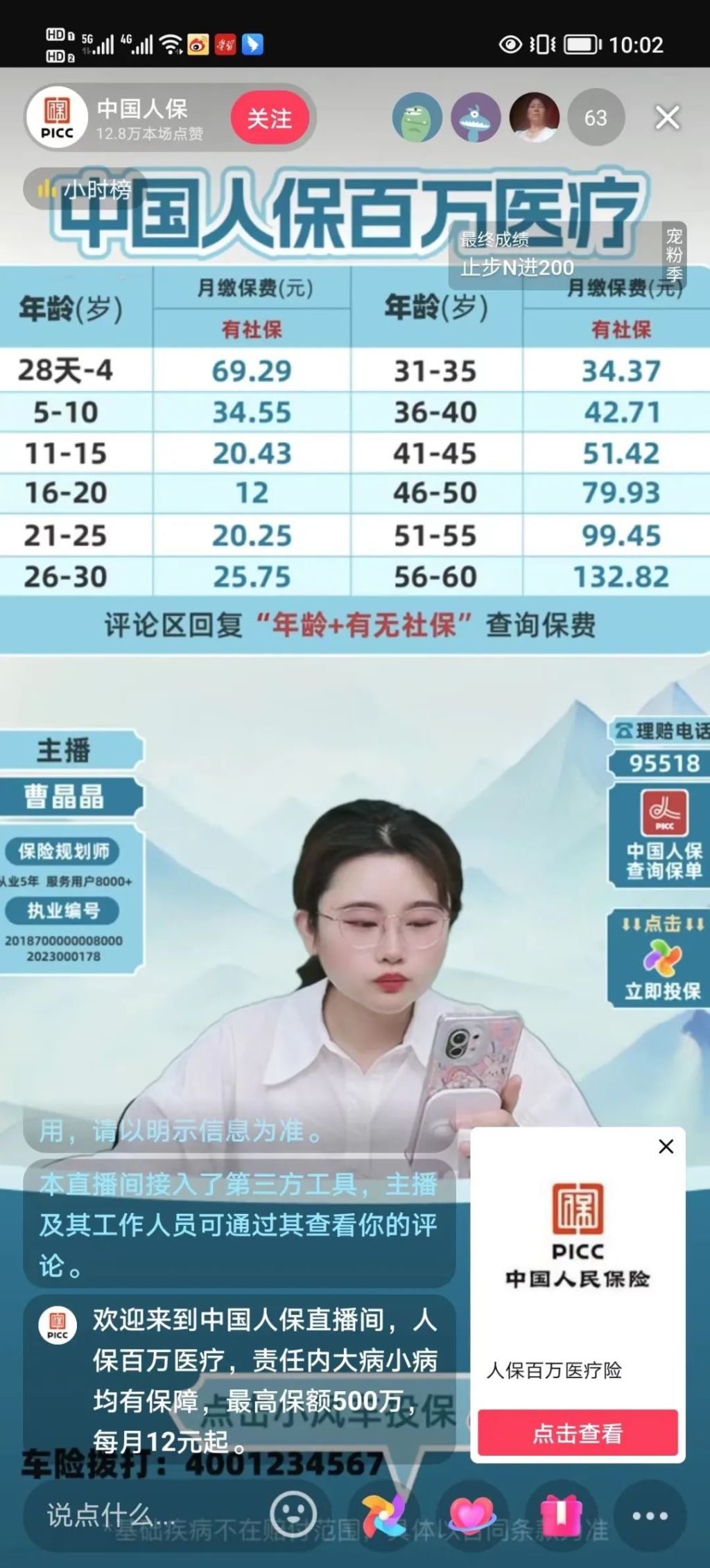 相较于直播推销贷款产品与信用卡的初步“试水”,直播间里卖保险早已不是什么新鲜事。早在2020年,平安集团首席保险业务官陆敏、华夏保险总精算师李建伟、水滴公司创始人兼CEO沈鹏曾先后走进直播间,讲解自家公司的保险产品,最终带货成绩十分可观。其中,华夏保险保费成交额更是超4亿元,创下保险行业直播带货最高成交纪录。