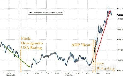 至于为何中长期美债收益率,在隔夜进入纽约时段后仍纷纷急升,我们其实也可以从上面的10年期美债收益率走势图中找到答案:真正重创债市多头的,明显是进入纽约时段后的两条消息——美国小非农ADP数据又一次远超所有经济学家预期、美国财政部在季度再融资计划中“狮子大开口”!