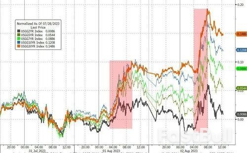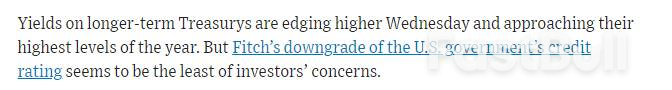 周三(8月2日),各期限美国国债多数下跌,10年期美债收益率更是一举升至了去年11月以来的最高水平,创下了年内的新纪录。由于同期美国三大股指也纷纷下挫,标普500指数更是47个交易日以来首度跌逾1%,这令不少业内人士纷纷将股债双杀的“元凶”,指向了惠誉周二对美国主权信用评级的下调。