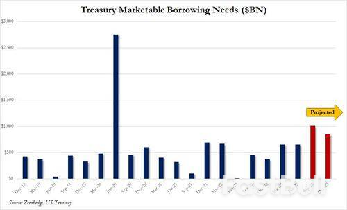 我们本周早些时候曾报道过,美国财政部本周一已将本季度借款规模预估提高至1万亿美元。交易商此前还预计财政部将增发其他债券,并将发行成长延续到2024年,财政部周三证实了这一点。