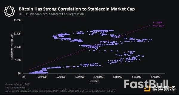 (译者注:这里的 r 表示稳定币市值与比特币价格的相关性,范围是 -1 到 1。-1表示100%负相关,1 表示百分百正相关;r 的平方代表解释力,例如这里指的是,比特币当前的价格有47%的部分可以通过稳定币市值来解释,剩余部分可能是其它原因造成的。)