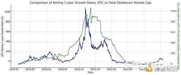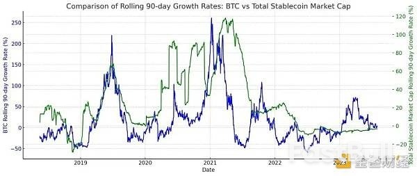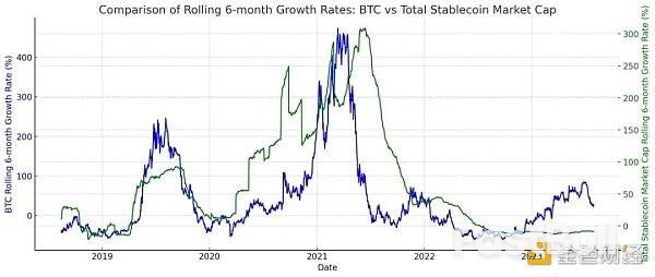 如果拉大到180天增长率,我们可以看到上个周期稳定币市值曾领先拉动比特币上涨,但在下跌中比特币领先于稳定币。