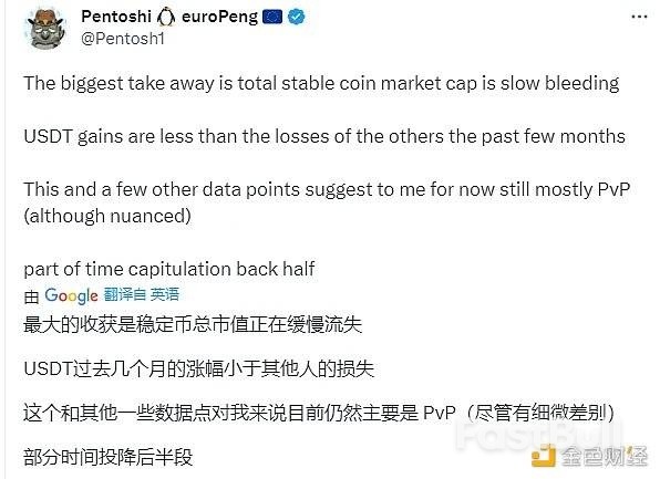综上,@Pentosh1的说法是正确的,目前整个市场仍处于 PVP 博弈状态,一旦我们看到稳定币大量流入,这可能预示着更多的散户和风险偏好者的回归。