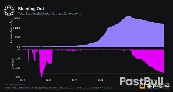 稳定币市值在近两年一直在流失,当前回落的幅度甚至已经回到了 2018 年熊市的程度。