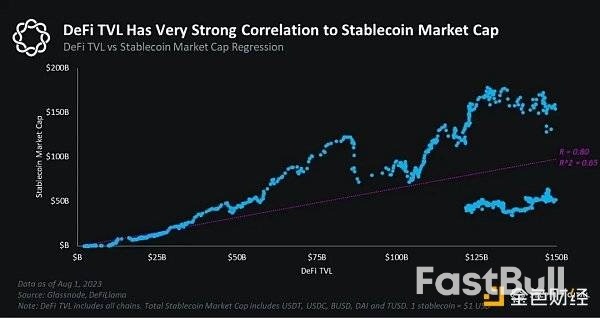 稳定币市值与 defi 总锁仓量有最强的相关性,r=0.80,r^2=0.65。