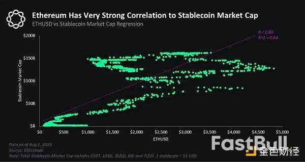 如果我们进行回归分析,我们会发现稳定币总市值与比特币有较强的相关性,r=0.68,r^2=0.47。